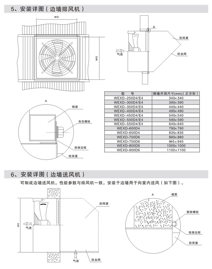 DWEX型不銹鋼邊墻風機采用前掠型葉片、低噪音的外轉子或內轉子風機專用電機直聯傳動,方形外殼設計可以方便地安裝在混凝土墻、磚墻或輕鋼壓型墻板上,方形防雨罩結構牢固,外形美觀。具有噪聲低、風量大、運行可靠、性能參數范圍廣、安裝簡便等特點,廣泛應用于廠礦企業車間和民用、商用建筑工程的邊墻壁式通風換氣。根據輸送介質的要求,可制成防腐、防爆型。